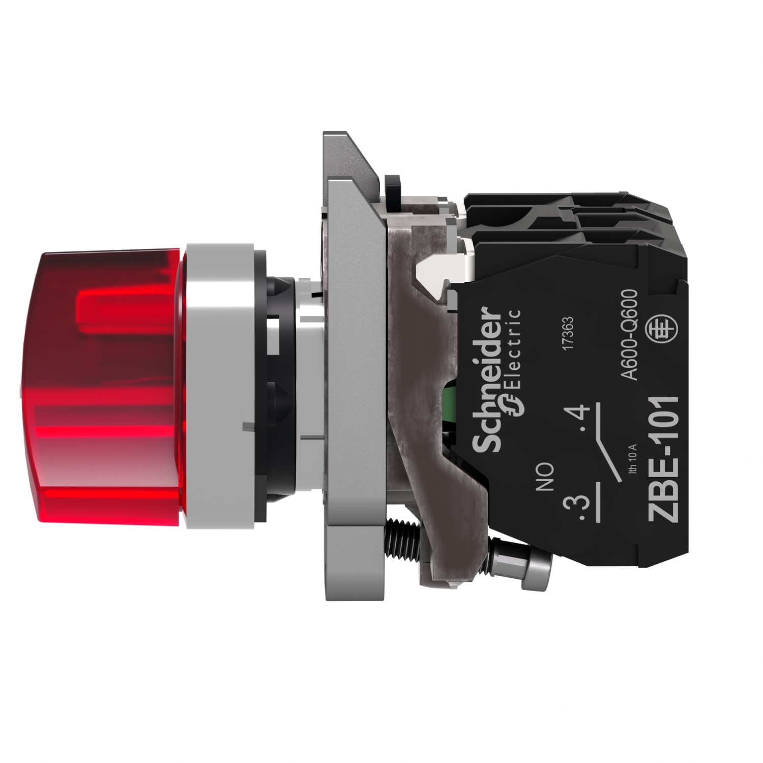 کلید سلکتور چراغ‌دار قرمز دوحالته سری XB4 اشنایدر با قطر نصب استاندارد 22.5mm، کاملاً با ماژول‌های Harmony سازگار بوده و قابلیت نصب کنتاکت‌های NO/NC و لامپ سیگنال را داراست.