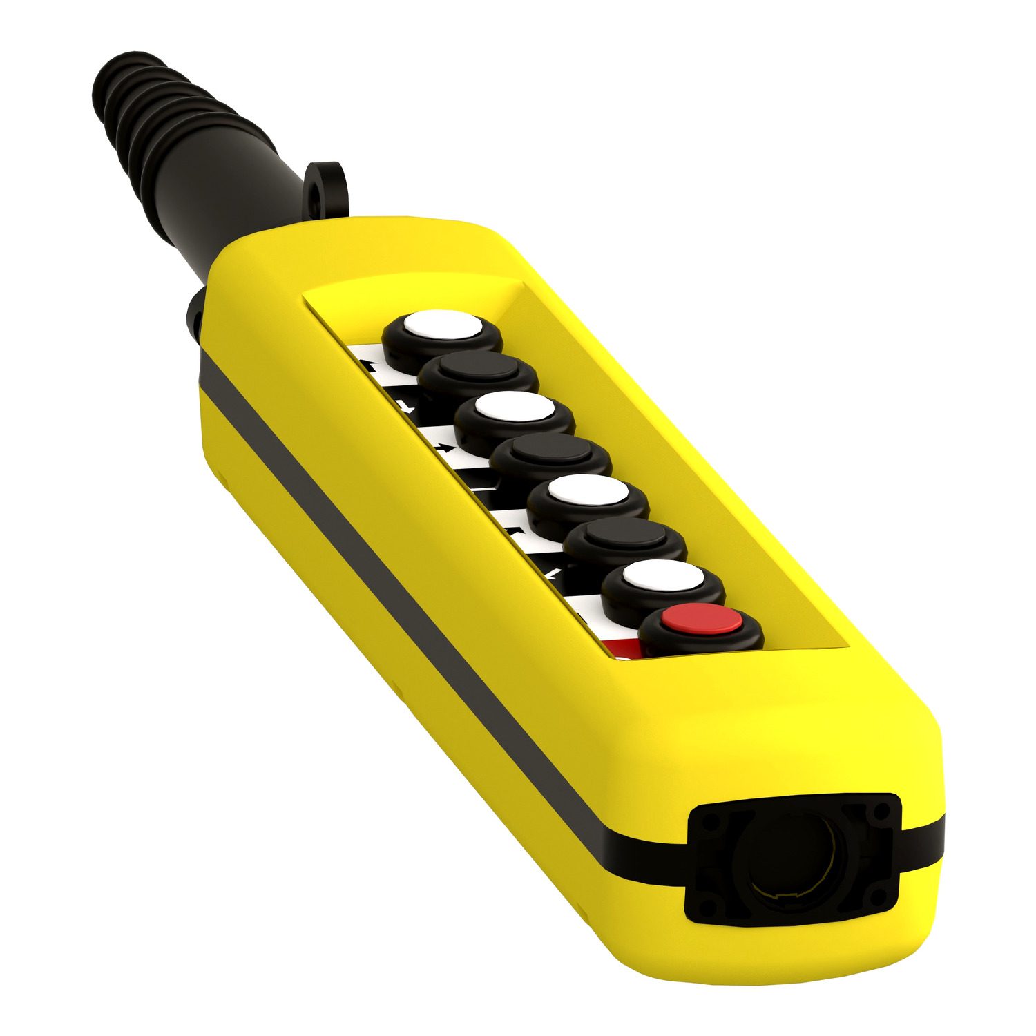 شاسی جرثقيل دو سرعته هشت دکمه اشنایدر یکی از پیشرفتهترین تجهیزات کنترلی در حوزه حمل و جابجایی بارهای سنگین است که با بهرهگیری از فناوری اشنایدر الکتریک طراحی و ساخته شده است. این شاسی دارای هشت دکمه عملکردی بوده و کنترل کامل بر جهتهای مختلف حرکت (بالا، پایین، چپ، راست) و عملکردهای کمکی نظیر زنگ، توقف اضطراری، فعالسازی قلاب و تنظیم سرعت را فراهم میسازد. قابلیت دو سرعته بودن در این شاسی به اپراتورها امکان کنترل نرم و دقیق در دو سرعت مختلف (کند و تند) را میدهد و از ضربههای ناگهانی به بار جلوگیری میکند.