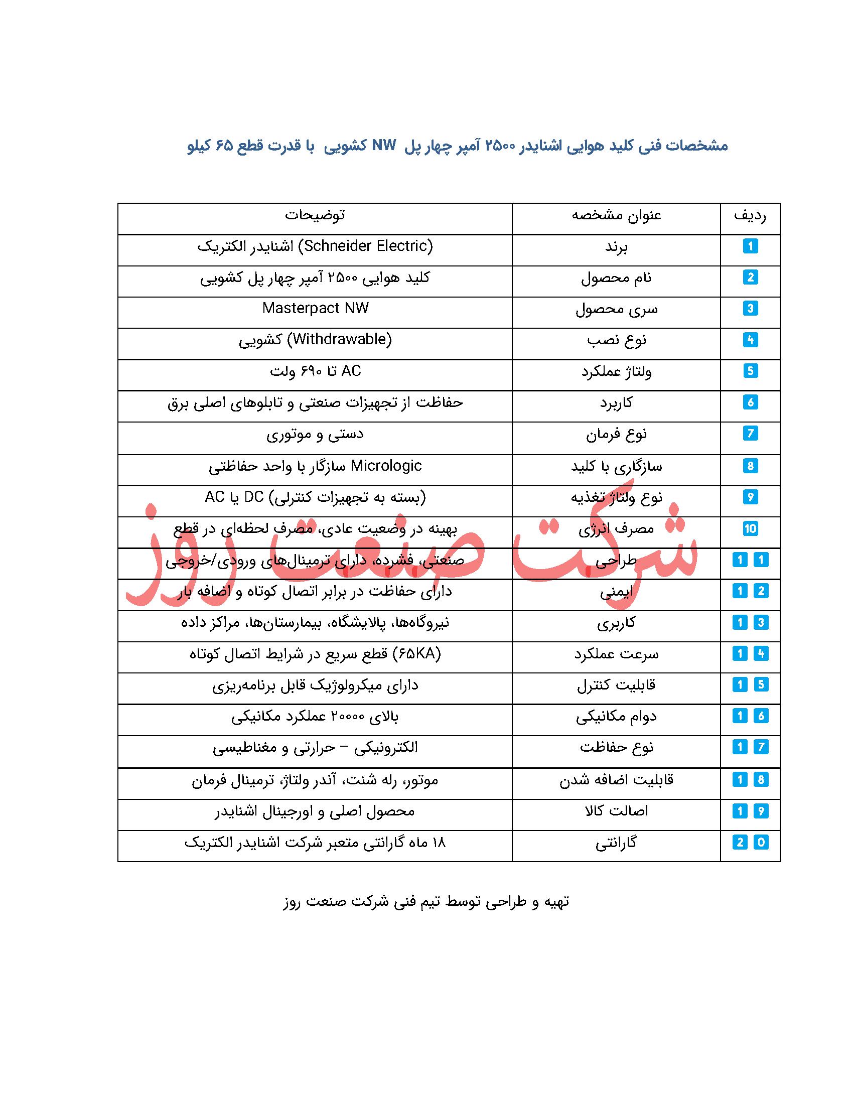 کليد هوایی اشنایدر 2500 آمپر چهار پل NW کشویی 65KA،با کدفنی 48306  و همچنین 18 ماه گارانتی شرکتی یکی از قدرتمندترین کلیدهای اتوماتیک فشار ضعیف سری Masterpact است. با قدرت قطع 65KA، طراحی کشویی و قابلیت نصب تجهیزات حفاظتی Micrologic، انتخابی بی‌نظیر برای تابلو برق‌های صنعتی و پروژه‌های حساس به شمار می‌رود.