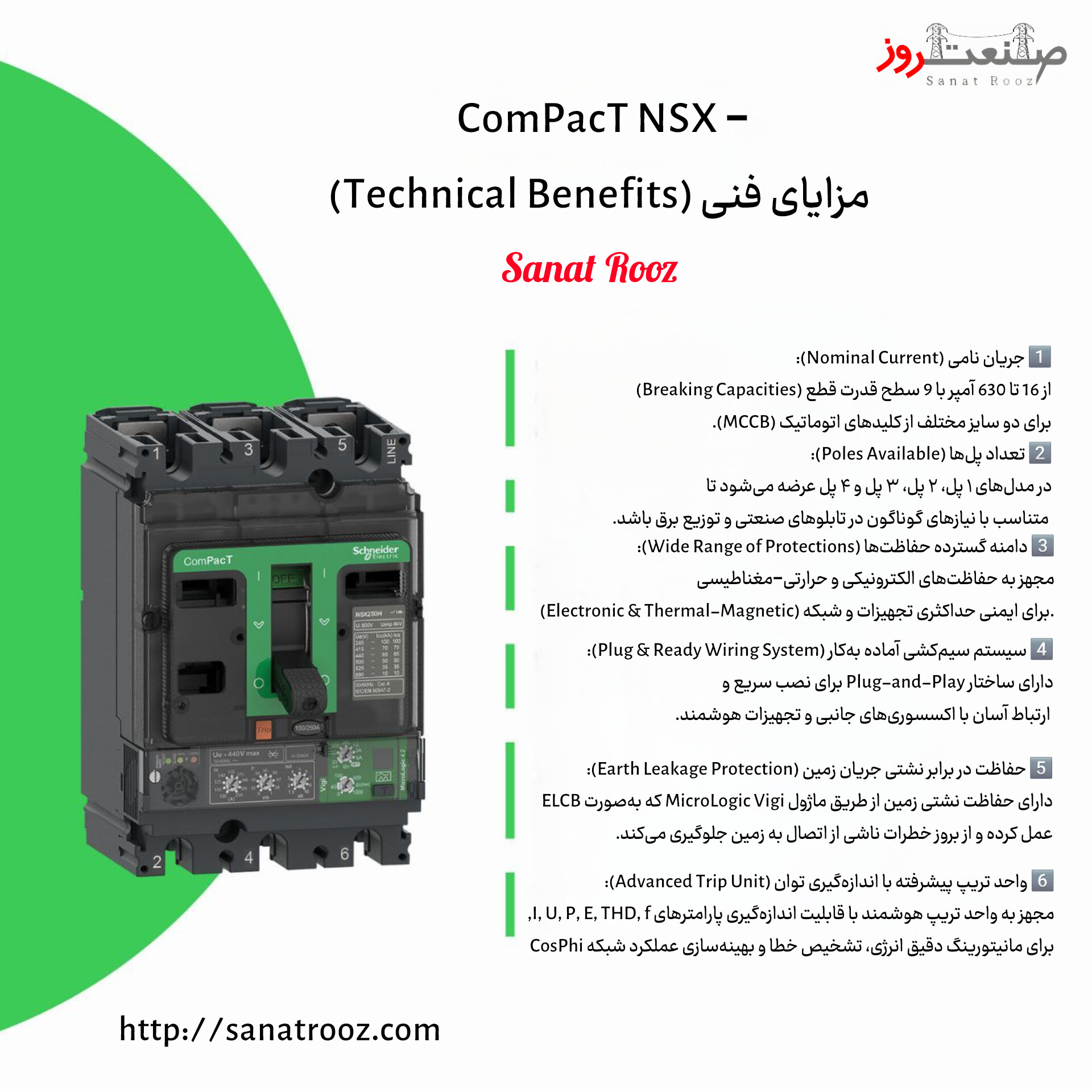 بدنه‌ی این کلید از پلی‌آمید تقویت‌شده ساخته شده و در برابر ضربه (IK07) و گردوغبار (IP40) مقاومت کامل دارد. ابعاد کوچک آن (105×161×86 میلی‌متر)، باعث سهولت نصب در فضاهای محدود تابلو برق شده است. قابلیت سازگاری کامل با تجهیزات جانبی مانند شنت‌تریپ، موتورکلید، آندرولتاژ و کنتاکت کمکی، امکان کنترل هوشمند مدار را فراهم می‌سازد. تمامی استانداردهای IEC 60947-2 / EN 60947 در این مدل رعایت شده و محصول دارای گواهی‌های Green Premium، RoHS، REACh و EAC می‌باشد که بیانگر کیفیت و پایداری محیط‌زیستی آن است.